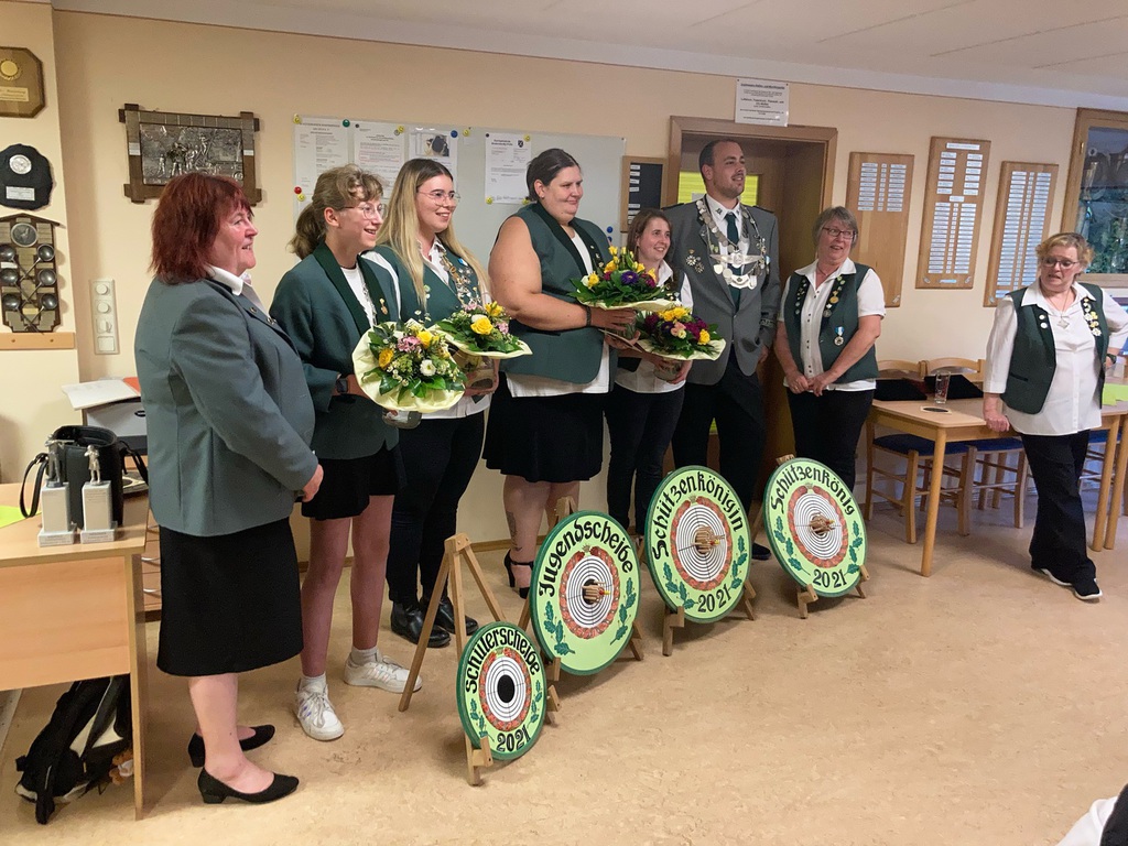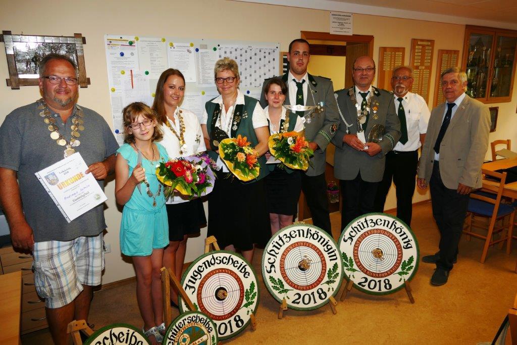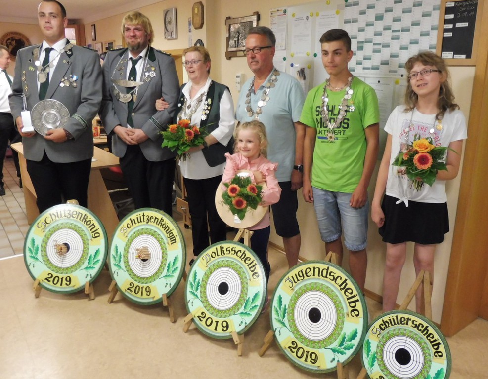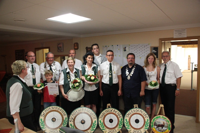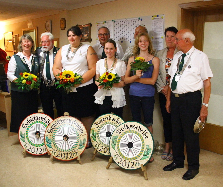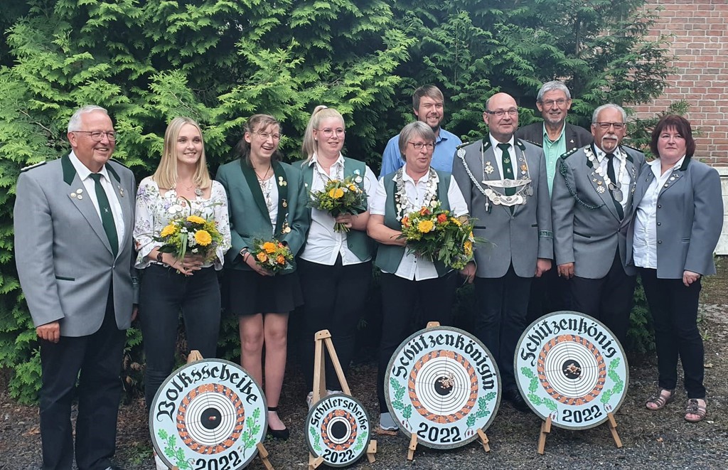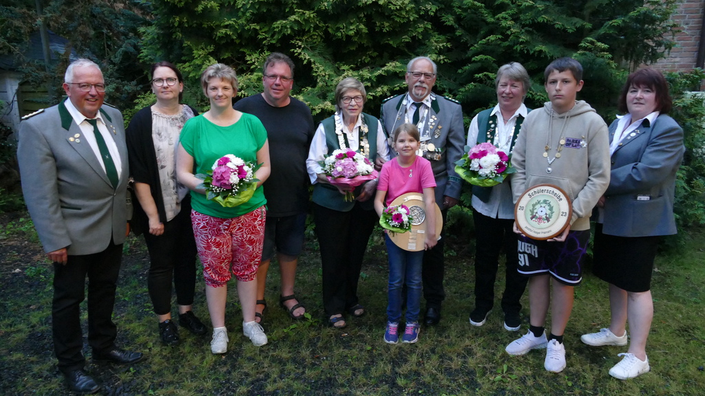 v.l.: Lichtpunkt (Sam-Trainer)-Königin Emily Röben, Schüler-König Noah Jablonski, Volkskönig Andreas Klabunde, Jung- und Jungring-Königin Lana Musewald, Schülerkönigin Lana Musewald, König u. Ringkönig Manuel Biel, Königin Theresa Meier, Ringkönigin Doris Hahn. Eingerahmt von der Damenleiterin Karin Genditzki und der Vorsitzenden Juliane Hörling.