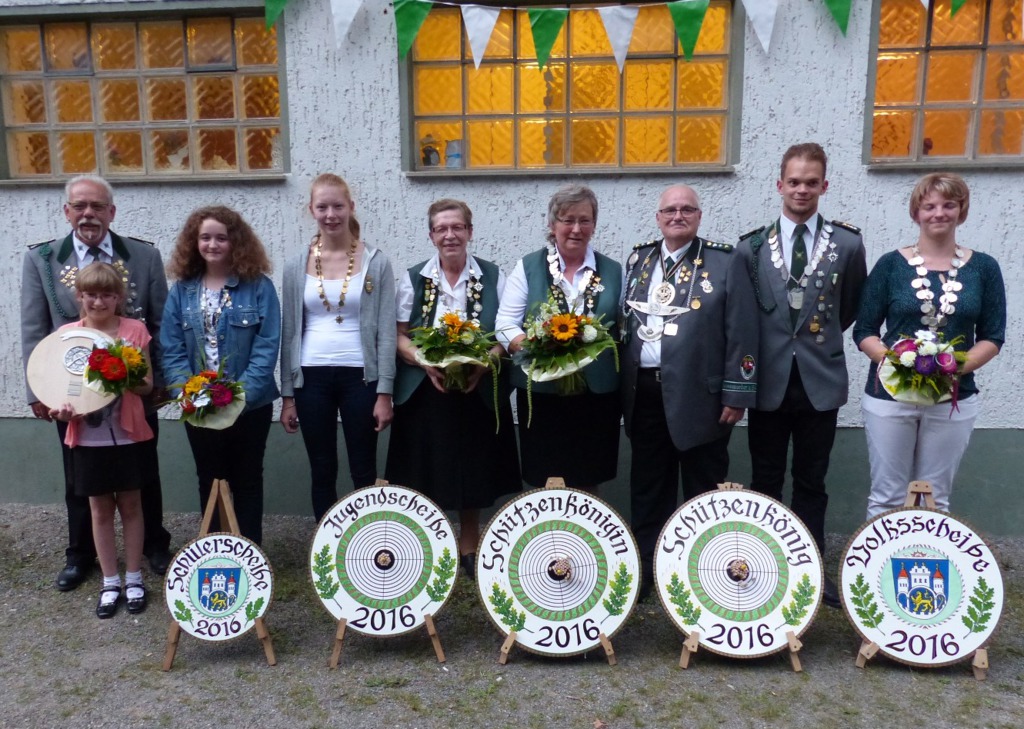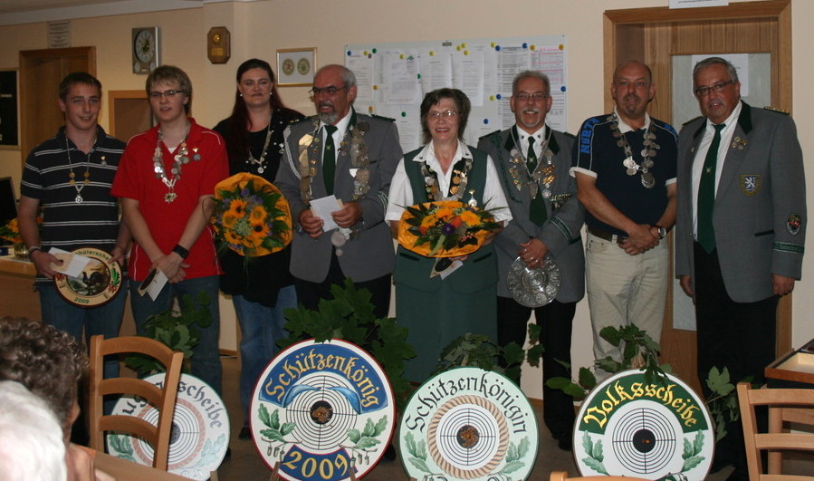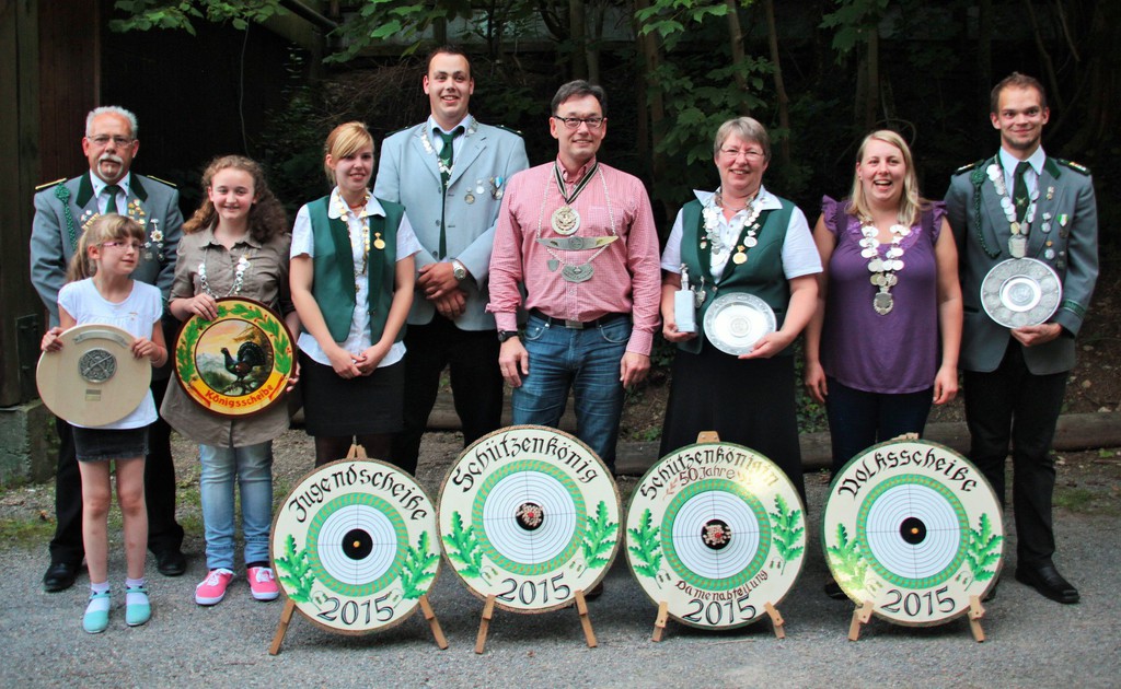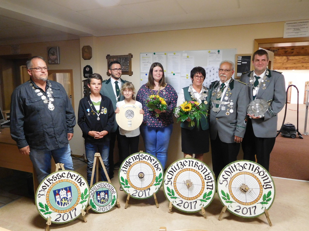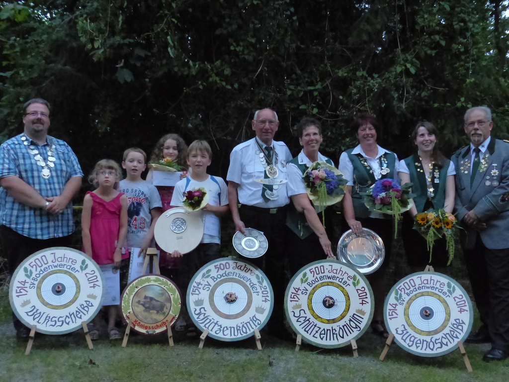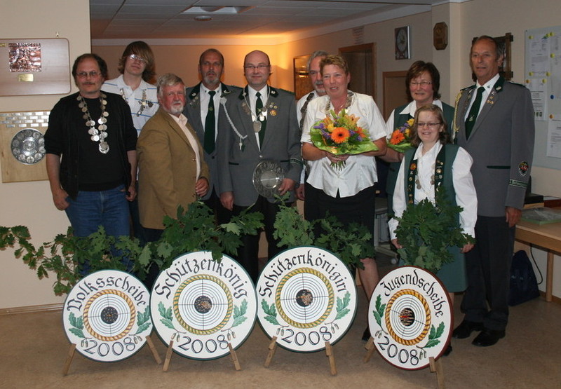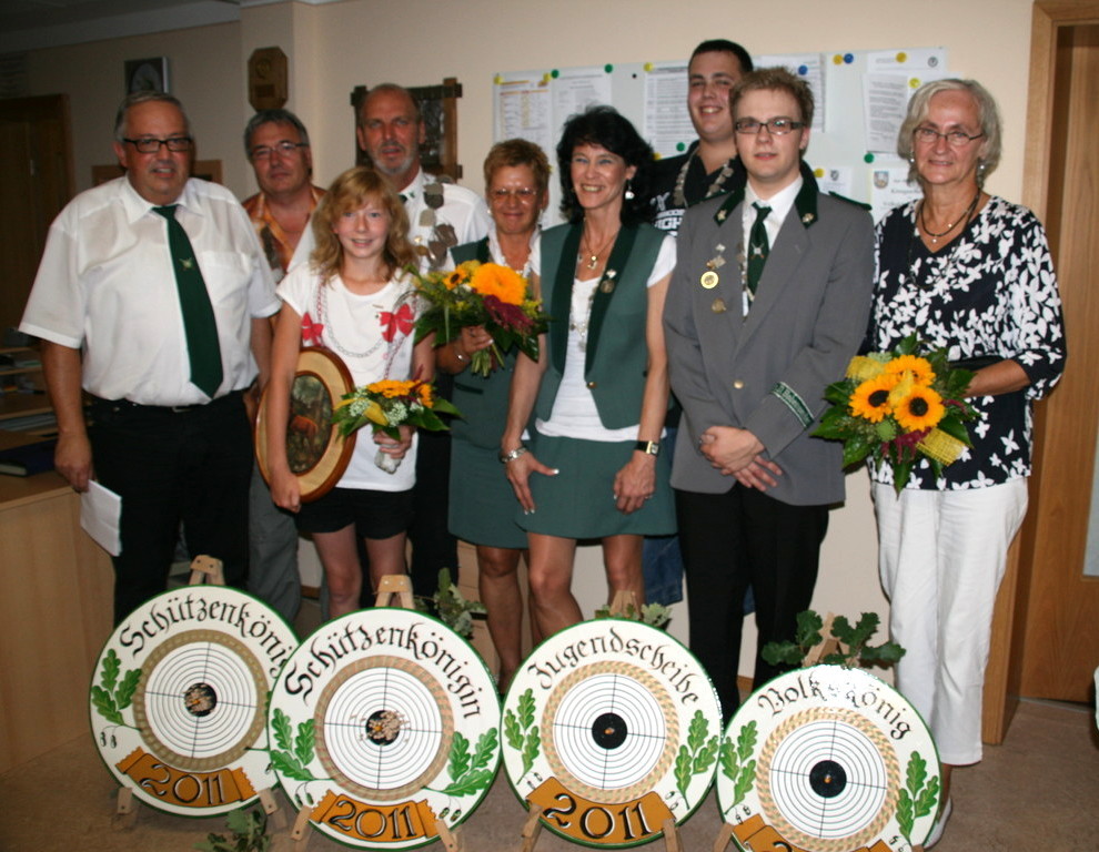 v.l.: Lichtpunkt (Sam-Trainer)-Königin Emily Röben, Schüler-König Noah Jablonski, Volkskönig Andreas Klabunde, Jung- und Jungring-Königin Lana Musewald, Schülerkönigin Lana Musewald, König u. Ringkönig Manuel Biel, Königin Theresa Meier, Ringkönigin Doris Hahn. Eingerahmt von der Damenleiterin Karin Genditzki und der Vorsitzenden Juliane Hörling.